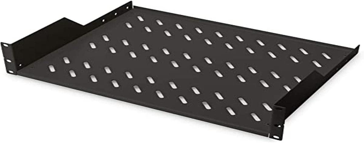 Estantería para fijación permanente a armarios de 483 mm (19″) – DN-19 TRAY-2-SW – Adjunto en frente, carga 25 kg, desde 450 mm profundidad, 2 unidades de altura, color negro